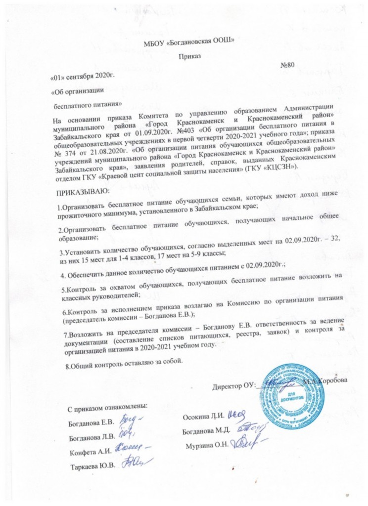 Приказ от 15.09.2020 №101 "О создании комиссии по контролю за питанием в образовательном учреждении"